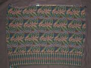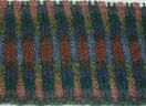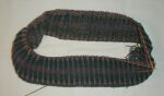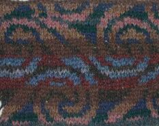 この作品のお手本の糸(Rowan Donegal Tweed)はもう無くなっているので、ネット上で見本を探し、それを別の糸(しぇーらのシェットランドヤーン)に置き換えてみたのですけど、見本を見比べただけで決めたのが安直でした。相互の糸の関係にまで頭が回っていなくて、いざ編んでみると地糸と配色糸がほとんど見分けがつかない部分ができてしまったり、妙に浮いた色が入っていたりします。右の写真だと案外渦巻き模様が見えていますが実物はもっと悪いです。このセーターは全体がこの模様で使う糸は11色。新しい色を検討して2枚目のスワッチを編み始めました。サンカ手袋はちょっとお休みです。(2003/05/16)